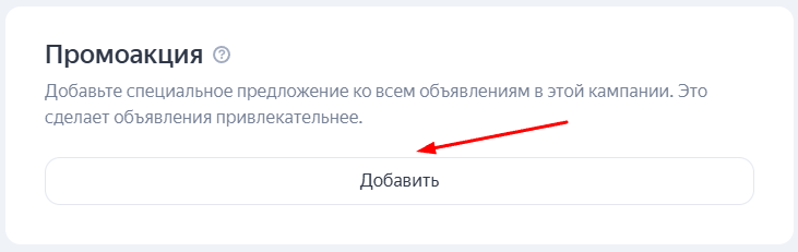 Откройте дополнительные настройки кампании. Нажмите на кнопку «Добавить промоакцию» и заполните нужные поля.
