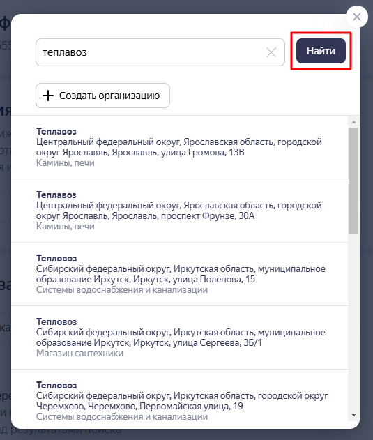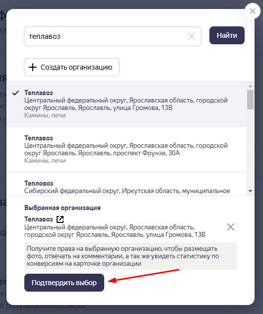 Выберите нужную организацию из результатов поиска и нажмите на кнопку «Подтвердить выбор».