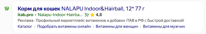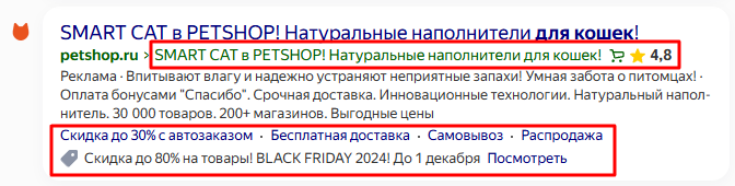 Сравните: вот объявление с отображаемой ссылкой, рейтингом магазина, быстрыми ссылками и промоакцией: