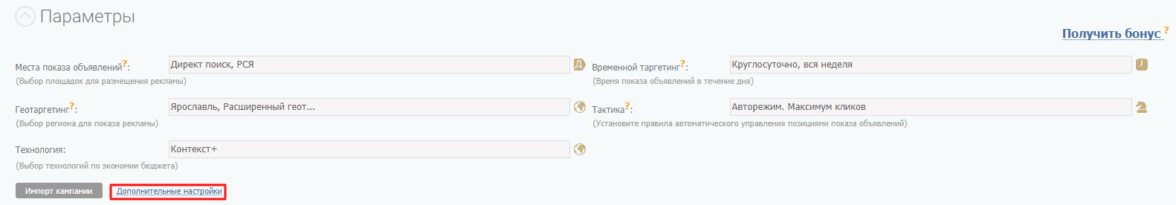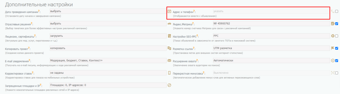 В PPC-модуле PromoPult контактную информацию можно добавить на шаге «Параметры».
