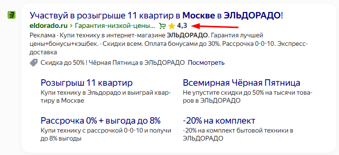 Если рейтинг организации в Яндекс Бизнесе составляет 4 звезды и более, то эти данные будут выводиться рядом с адресом и отображаемой ссылкой в объявлении на поиске.