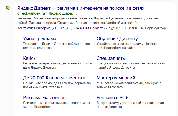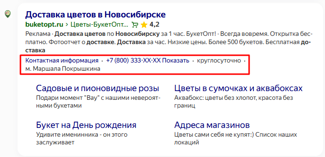 Расскажем подробно о назначении и настройке каждого дополнительного элемента. Начнем с тех, которые можно добавить в объявления на поиске Яндекса.