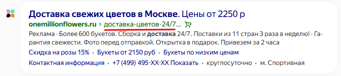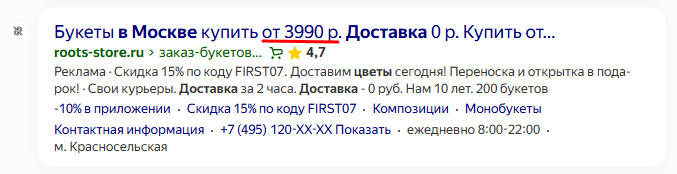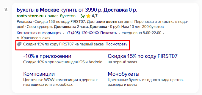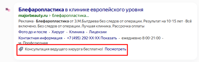 Еще один способ увеличить кликабельность объявлений — добавить блок с промоакцией. Рядом с объявлением будет показана яркая метка с информацией о вашем рекламном предложении.