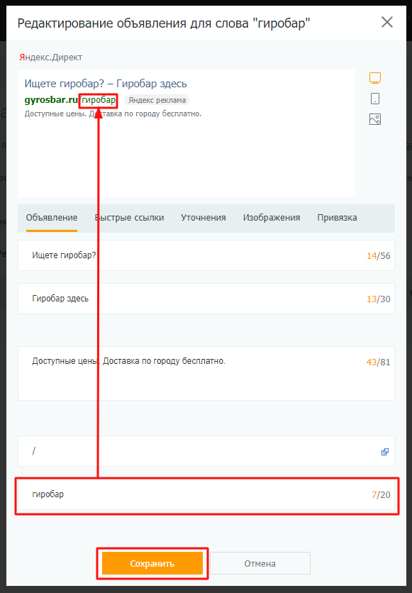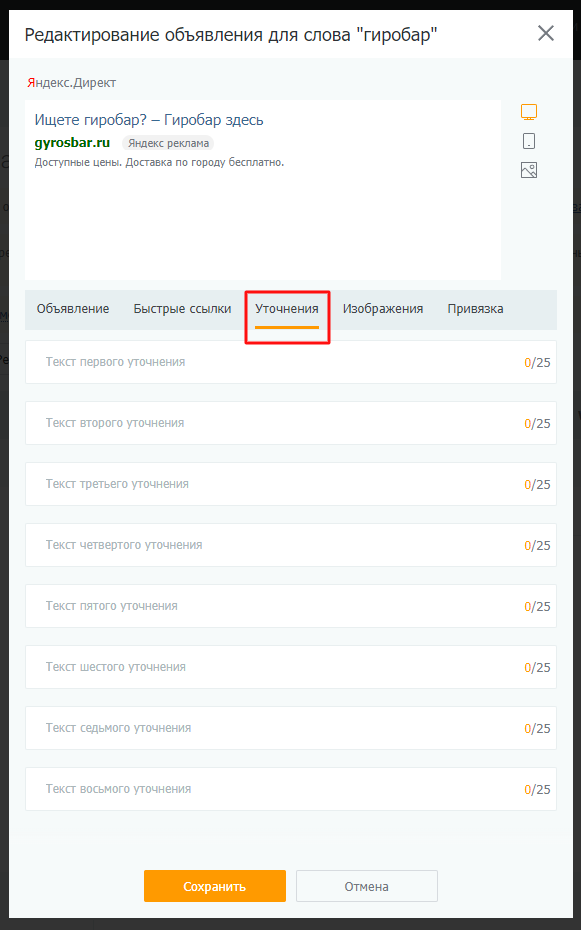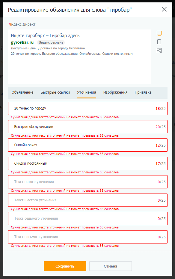 Можно добавить до восьми уточнений длиной до 25 символов, суммарной длиной не более 66-ти знаков. Вписывайте тексты уточнений, нажимайте кнопку «Сохранить» — и готово. Если суммарная длина уточнений начнет превышать 66 символов, система об этом предупредит: