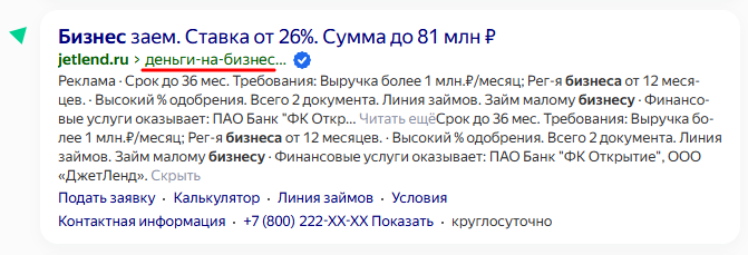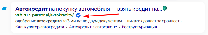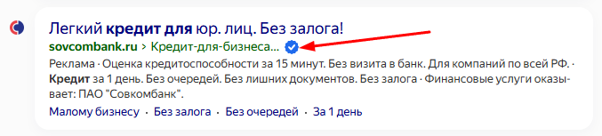 Если организация добавлена в Государственный реестр Центрального Банка РФ, то рядом с рекламой появится соответствующий значок. Важно, чтобы целевая страница находилась на том же домене, что и официальный сайт финансовой организации.