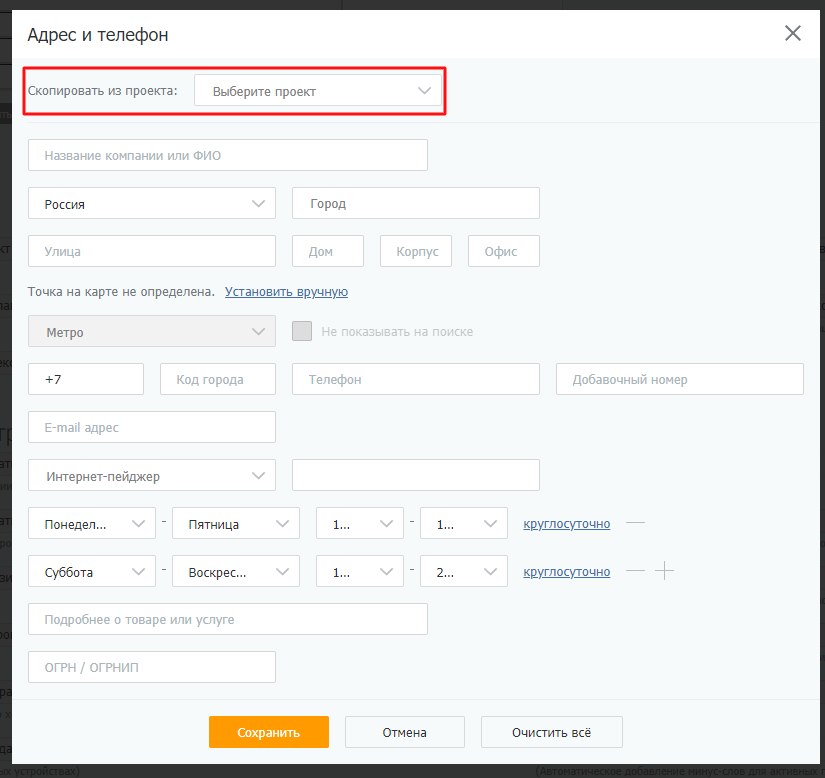 Во всплывающем окне укажите контактные данные и сохраните изменения. Информацию можно не заполнять заново, если в системе уже есть проект с этими контактными данными — просто скопируйте их.