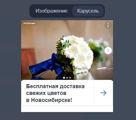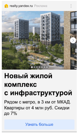 Например, в этом объявлении есть изображение, быстрые ссылки и кнопка действия: