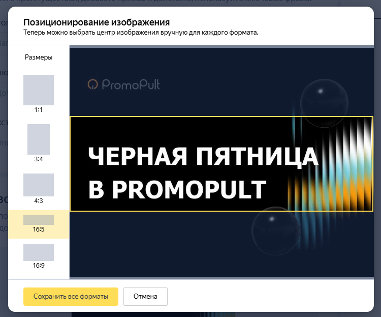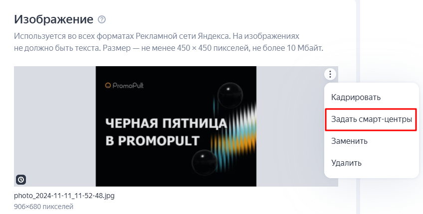 Для каждой картинки можно задать свой смарт-центр. Это область, которая будет определена центральной при кадрировании изображения для рекламы разных форматов. Чтобы настроить позиционирование вручную, нажмите «Задать смарт-центры».