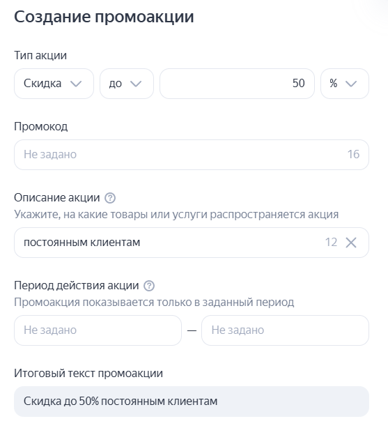 Итоговый текст рекламного предложения автоматически формируется из типа акции, скидки, описания и дат проведения.
