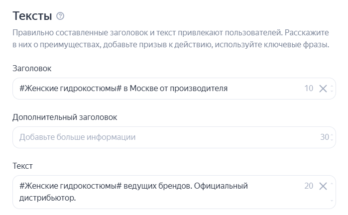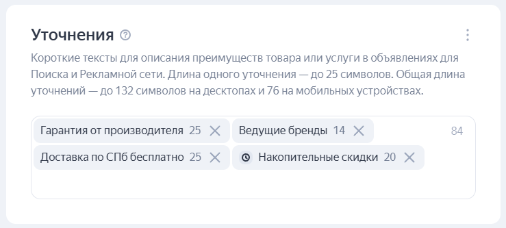Максимальная длина одного уточнения — 25 символов. Суммарная длина всех слов в этом блоке не должна превышать 132 знака на десктопах и 76 на мобайле.