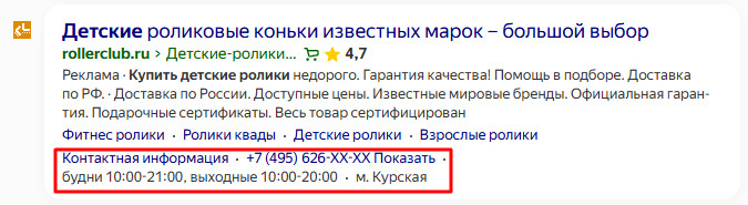 Дополнительные элементы (расширения) позволяют сообщить в объявлении больше информации о продукте и рекламодателе: рассказать о преимуществах, указать цену, контактные данные, рейтинг и прочее. Кроме того, расширения делают объявление больше и заметнее среди других.