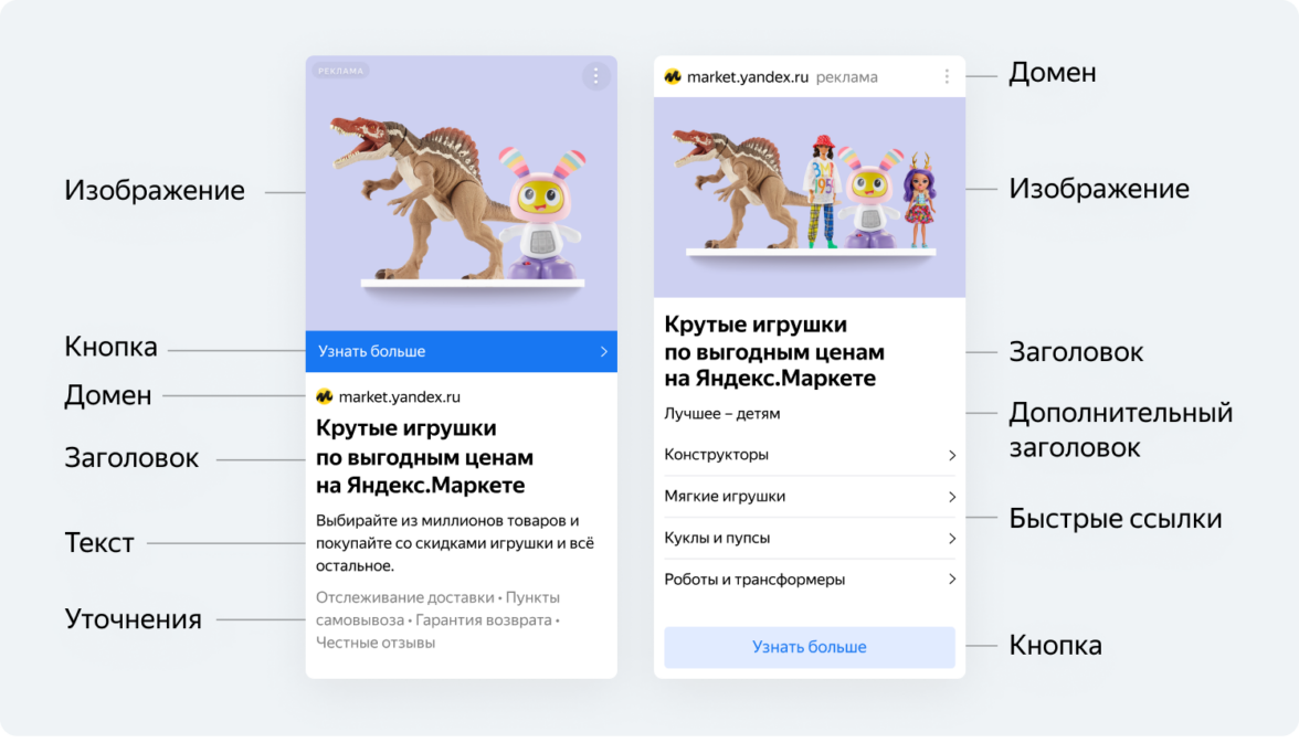 Дополнительные элементы показываются в объявлениях РСЯ в зависимости от площадки, места на странице и рекламного формата. За сочетание элементов объявления в рекламной сети Яндекса отвечает технология Smart Design.