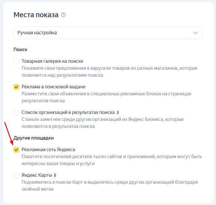 При использовании видеодополнений в рекламной кампании должны быть включены показы в сетях. Проверить это можно на странице настроек кампании в блоке «Места показа».