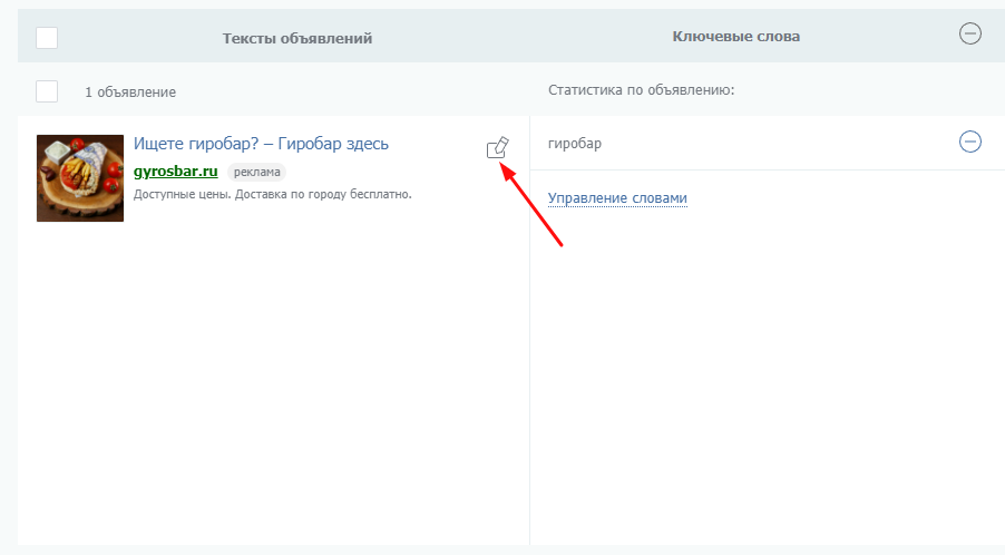 1. Откройте кампанию, выберите группу и нужное объявление в ней. Нажмите на кнопку «Редактировать».