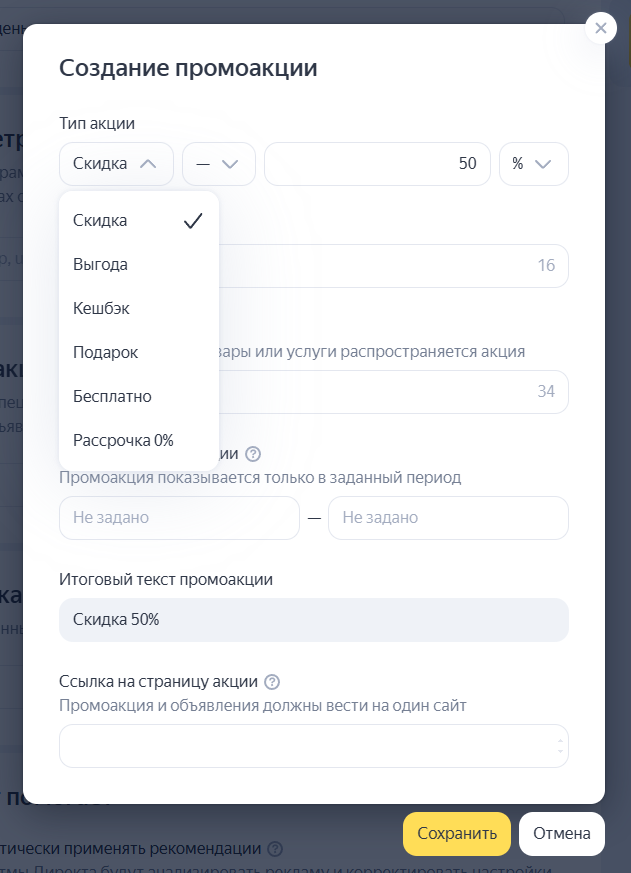 Тип акции. Например, «Скидка» или «Подарок». Доступны 6 разных вариантов.