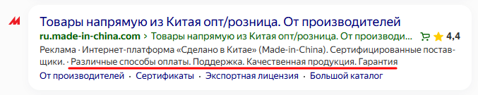 дополнения из внешних источников — рейтинги магазина на Яндекс Маркете, организации в Яндекс Бизнесе, сайта в Яндекс Браузере, признаки официального дилера, официальной финансовой организации и другие.