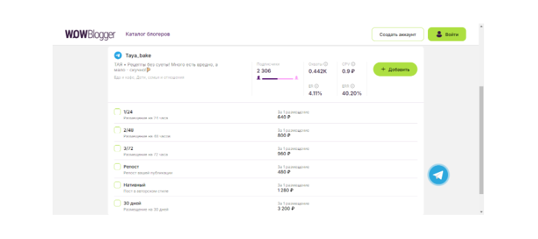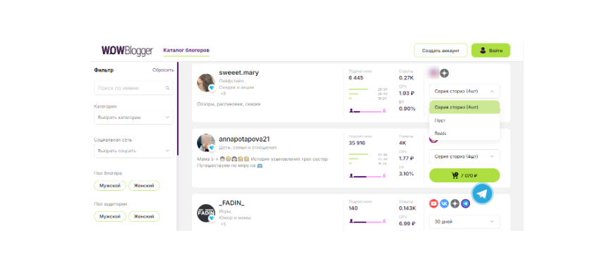 Пользоваться каталогом теперь удобнее и быстрее: все площадки, на которых блогеры готовы размещать рекламу, отображаются прямо в нем (и не надо переходить в карточку блогера, как раньше). А еще здесь можно посмотреть стоимость конкретного типа размещения и статистику по нему.