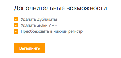 Проставьте галочки напротив «Удалить дубликаты» и «Удалить знаки ? + -», чтобы избавиться от мусора. Также можно задать настройку «Преобразовать в нижний регистр», если в файле имеются слова, прописанные заглавными буквами.