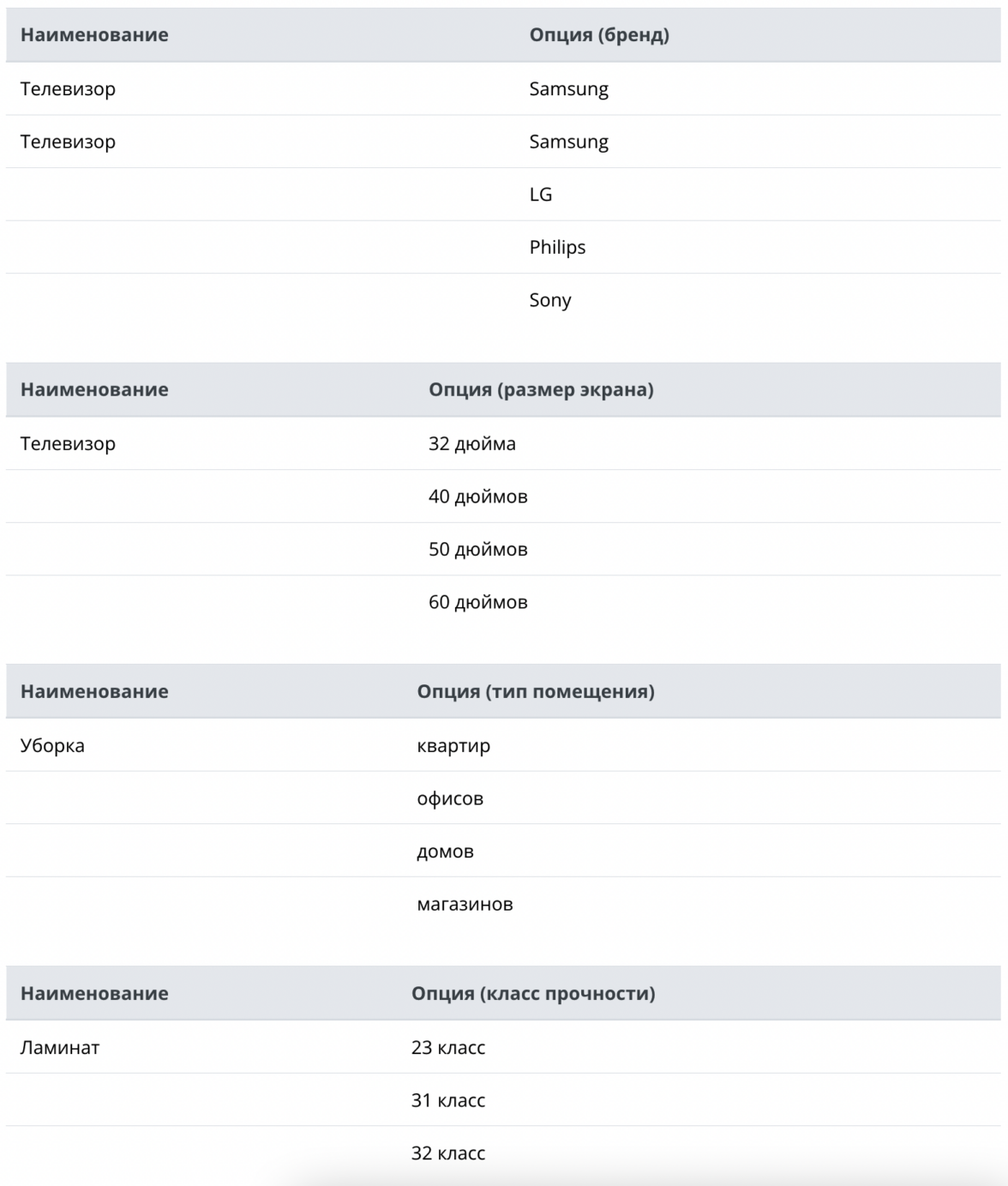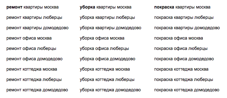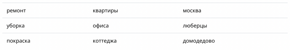 Слова в разных колонках должны сочетаться по смыслу и значению во всех комбинациях. Например, если в одну из колонок скопировать названия брендов, а в другую — названия моделей, результаты перемножения не будут корректными для большей части запросов. То же касается ряда опций или характеристик товаров и услуг, которые могут быть применимы не для всех вариантов перемножения.