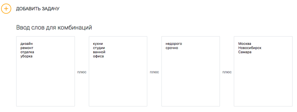 Перейдите на страницу «Комбинатора» и создайте новую задачу. Введите в колонках ключевые слова, подлежащие перемножению. Для комбинаций можно использовать от двух до четырех списков слов.