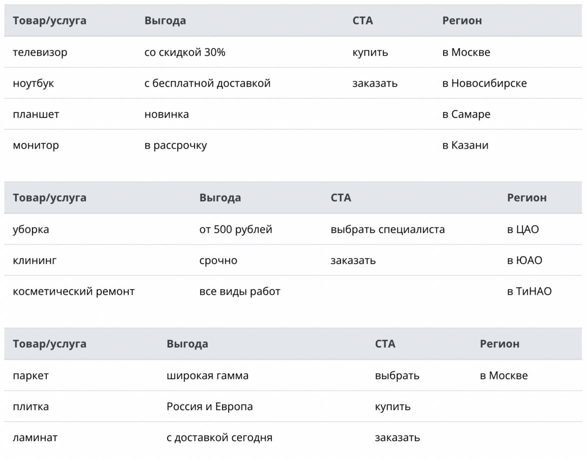 Первая колонка может содержать наименование товара/ услуги с определенными свойствами, характеристиками — их также можно предварительно склеить с помощью комбинатора. В числе уточнений могут быть бренды, размеры, материалы, возраст, пол, цвет и так далее. Это позволит точнее таргетировать объявление и получать более целевые клики.