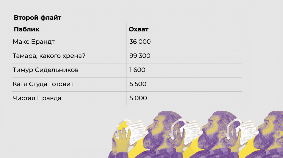По результатам второго флайта прирост подписчиков составил 657 человек: с 34 378 до 35 035. Отдельно отметим паблик «Тамара, какого хрена», у которого лучшие показатели среди блогеров — не только самое высокое вовлечение, но и множество положительных комментариев.