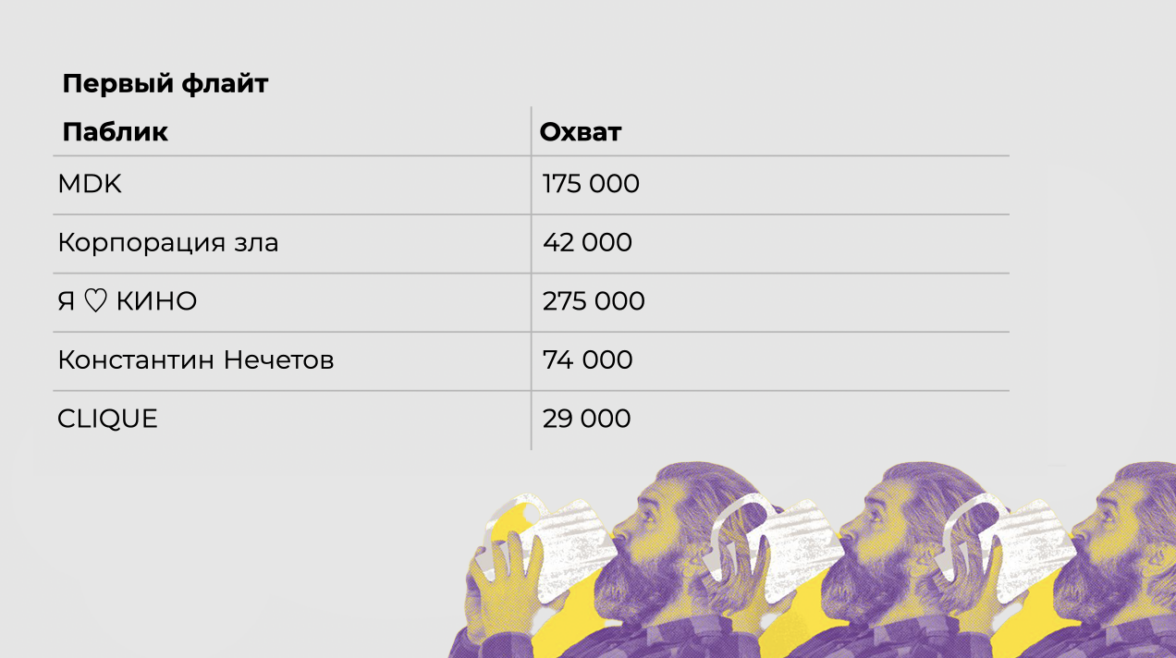 После первого флайта количество подписчиков увеличилось на 1054 человека: с 32 900 до 33 954. При этом общий охват всех постов составил 595 000.