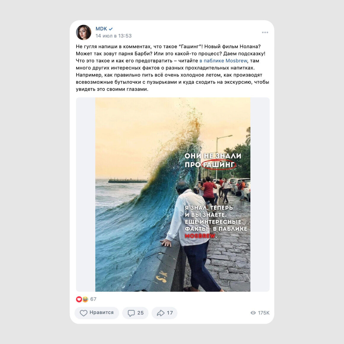 Контент в группе МПК легкий, веселый и познавательный. А наша главная цель — привлечь в нее активную молодую аудиторию. Так что мы решили делать ставку на развлекательные сообщества с похожим контентом и нужной ЦА. К тому же юмор — удобный инструмент, чтобы раскрыть тему алкоголя, не упоминая его напрямую.