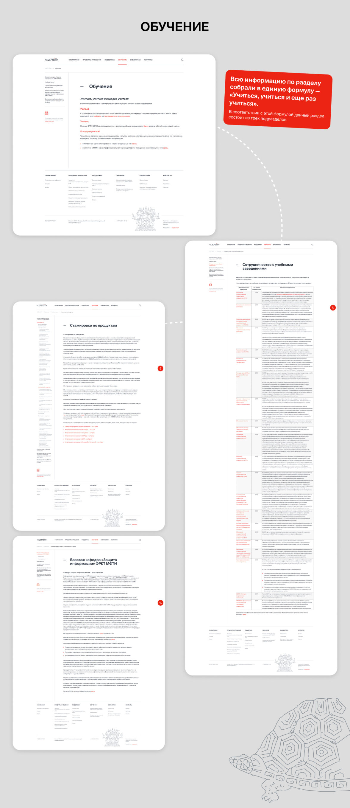 Работе с этим разделом мы уделили особое внимание, тщательно обдумывая структуру предоставления многочисленной информации. В итоге нам удалось собрать всю информацию в единую формулу — «Учиться, учиться и еще раз учиться», которая в первую очередь отражает одну из главных ценностей компании, а во вторую — показывает, что каждый этап обучения является новой ступенью в понимании сферы. Каждое слово «Учиться» в нашей формуле является кликабельной ссылкой на подразделы «Базовая кафедра «Защита информации» ФРТК МФТИ», «Сотрудничество с учебными заведениями» и «Стажировки по продуктам».