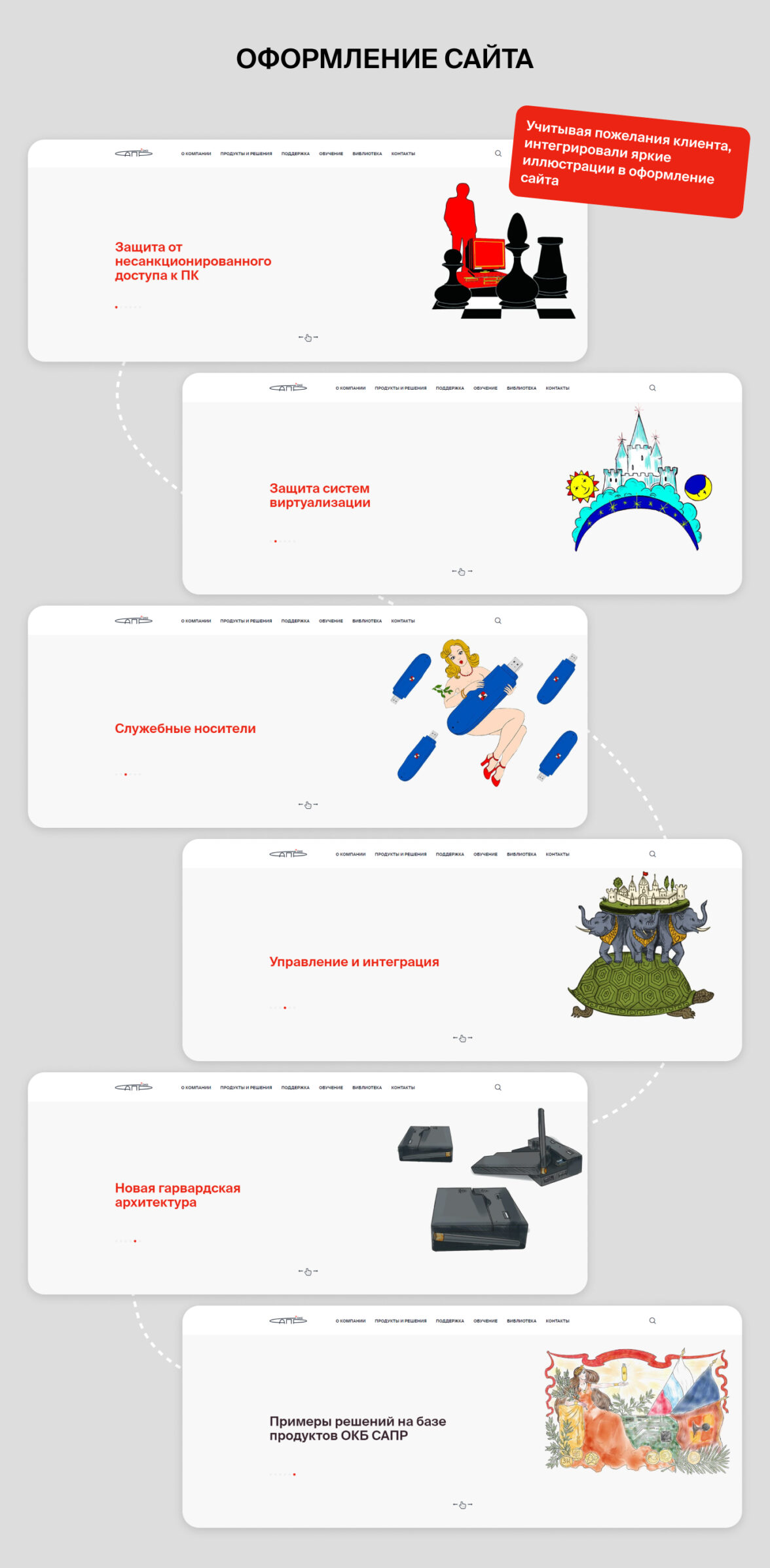 В самом начале работы клиент поделился с нами своим видением будущего корпоративного сайта. Так, например, практически каждый раздел сайта должен был содержать красочные иллюстрации, которые вручную отрисовывал дизайнер со стороны клиента. Мы, со своей стороны, должны были адаптировать иллюстрации к аутентичному дизайну сайта.