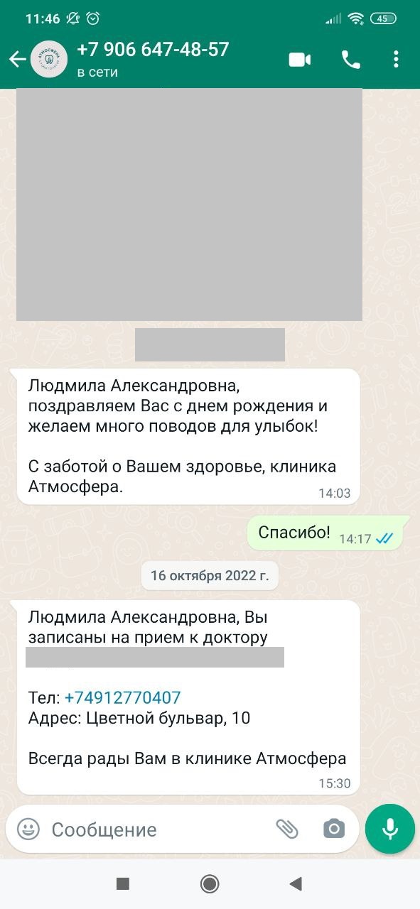 Пример поздравления клиента с днём рождения и напоминание о записи через WhatsApp Business