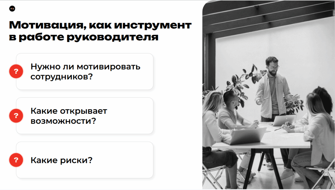 Освоили функции мотивации и контроля в управленческом цикле, связь мотивации руководителя и команды, особенности на разных этапах развития сотрудников.