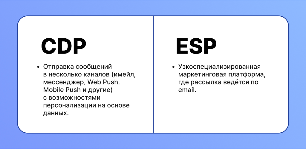 DMP собирает информация первого, второго и третьего порядка, чтобы формировать маркетинговые предложения. ESP отвечает за сбор базы и рассылки по email. CRM отражает весь путь клиента от контакта с отделом продаж до конверсии. ERP — инструмент управления внутренними ресурсами компании.