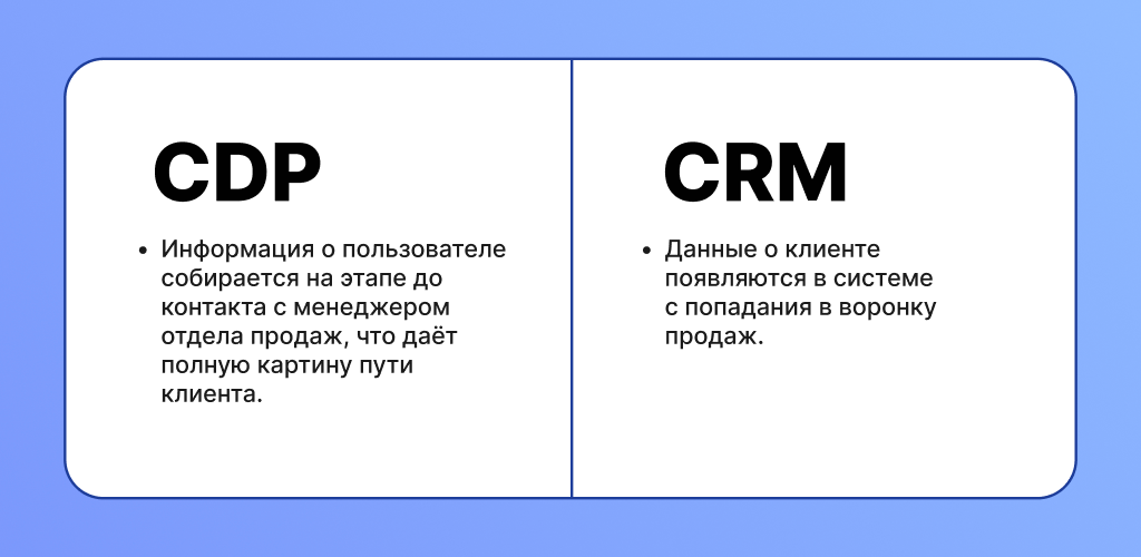 CDP объединяет сбор, структурирование и объединение данных клиента в единый профиль и управление инструментами коммуникации с аудиторией. Такая платформа повышает эффективность маркетинга, автоматизирует процессы, персонализирует предложения.