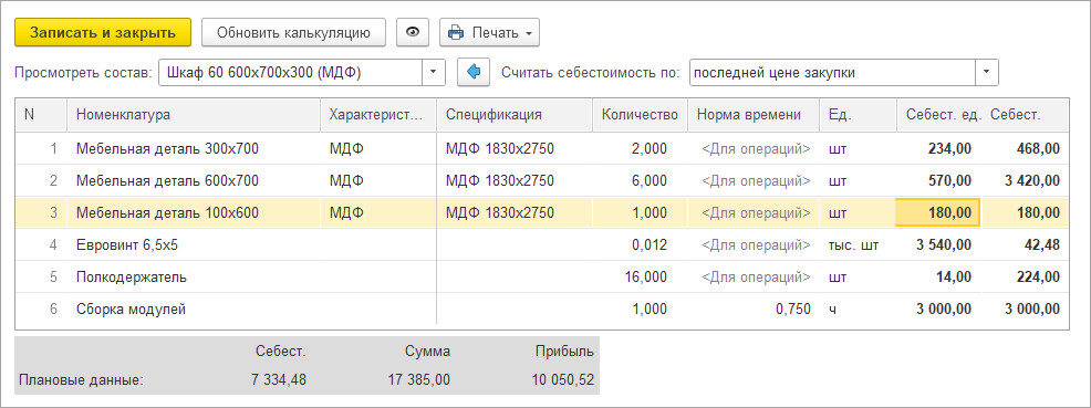 Следующий инструмент — калькуляция заказа. Рассчитывает себестоимость продукции/услуги по конкретному заказу с учётом всех затрат (материалы, зарплата, логистика, амортизация, плановая прибыль и др.)