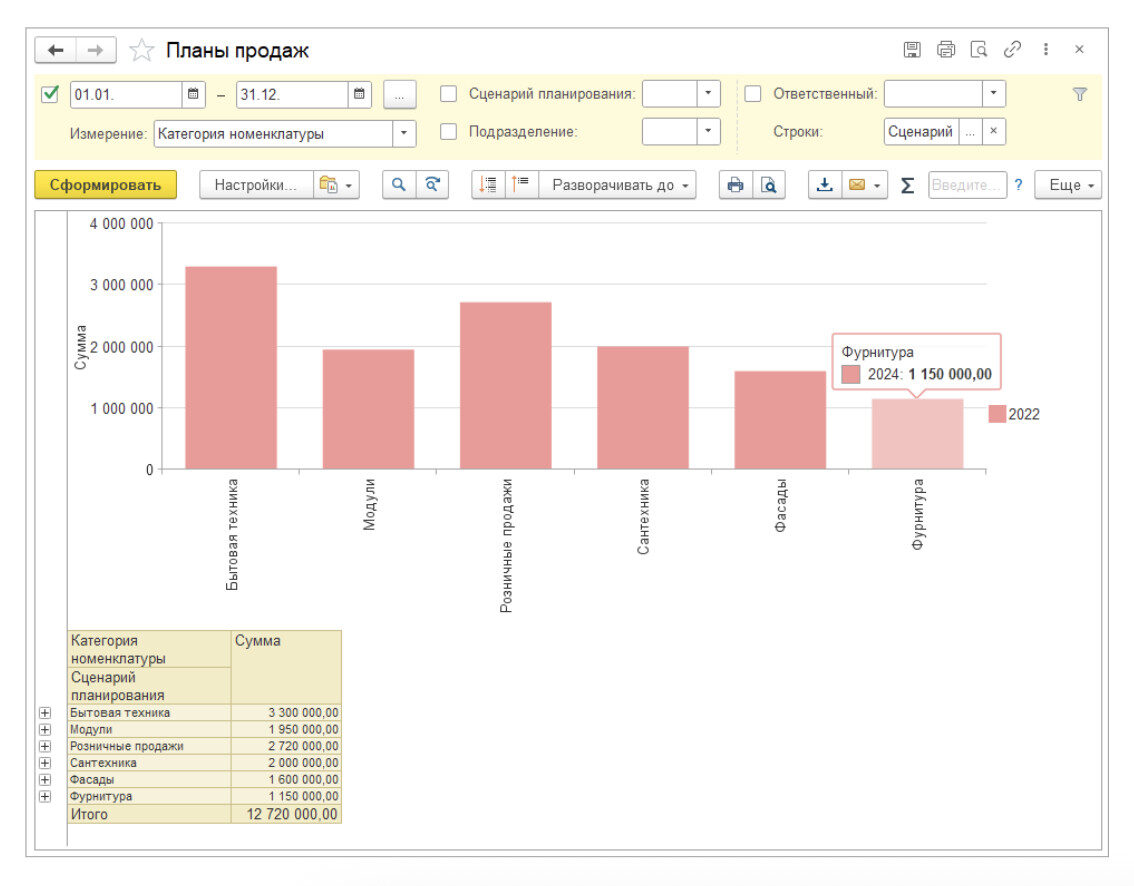 Пример плана продаж в приложении БизКуб Розница в разрезе категорий номенклатуры