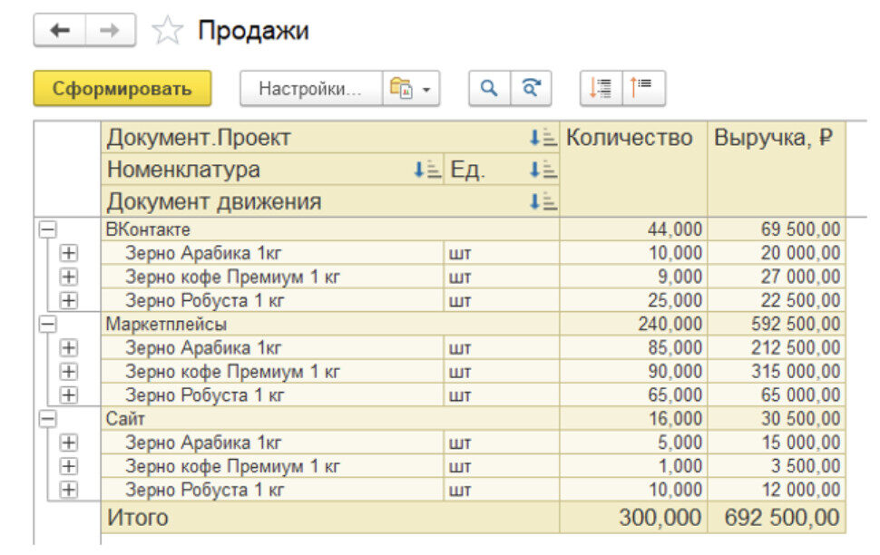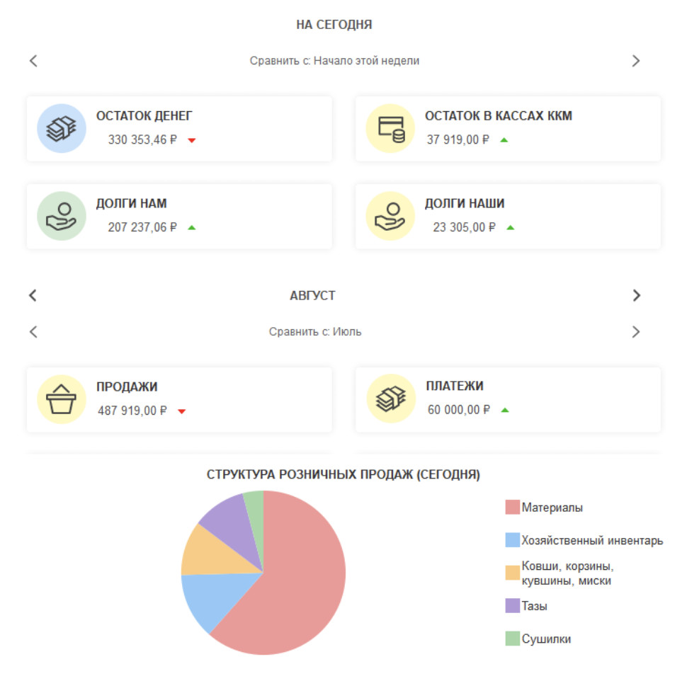 Полезно анализировать продажи в динамике по периодам в количественном и стоимостном выражении. Отчет по продажам показывает такую информацию в разрезе разных, интересующих бизнес параметров: магазины, каналы, товары, продавцы и прочее.