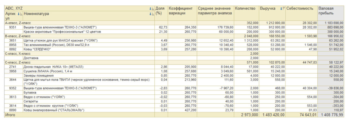 Еще один полезный инструмент — ABC-XYZ — отчет определяет, какие товары или клиенты прибыльные и стабильные. Например, можно вовремя избежать проблем со складом и освободить деньги, сократив долю «пылящихся» на полках товаров.