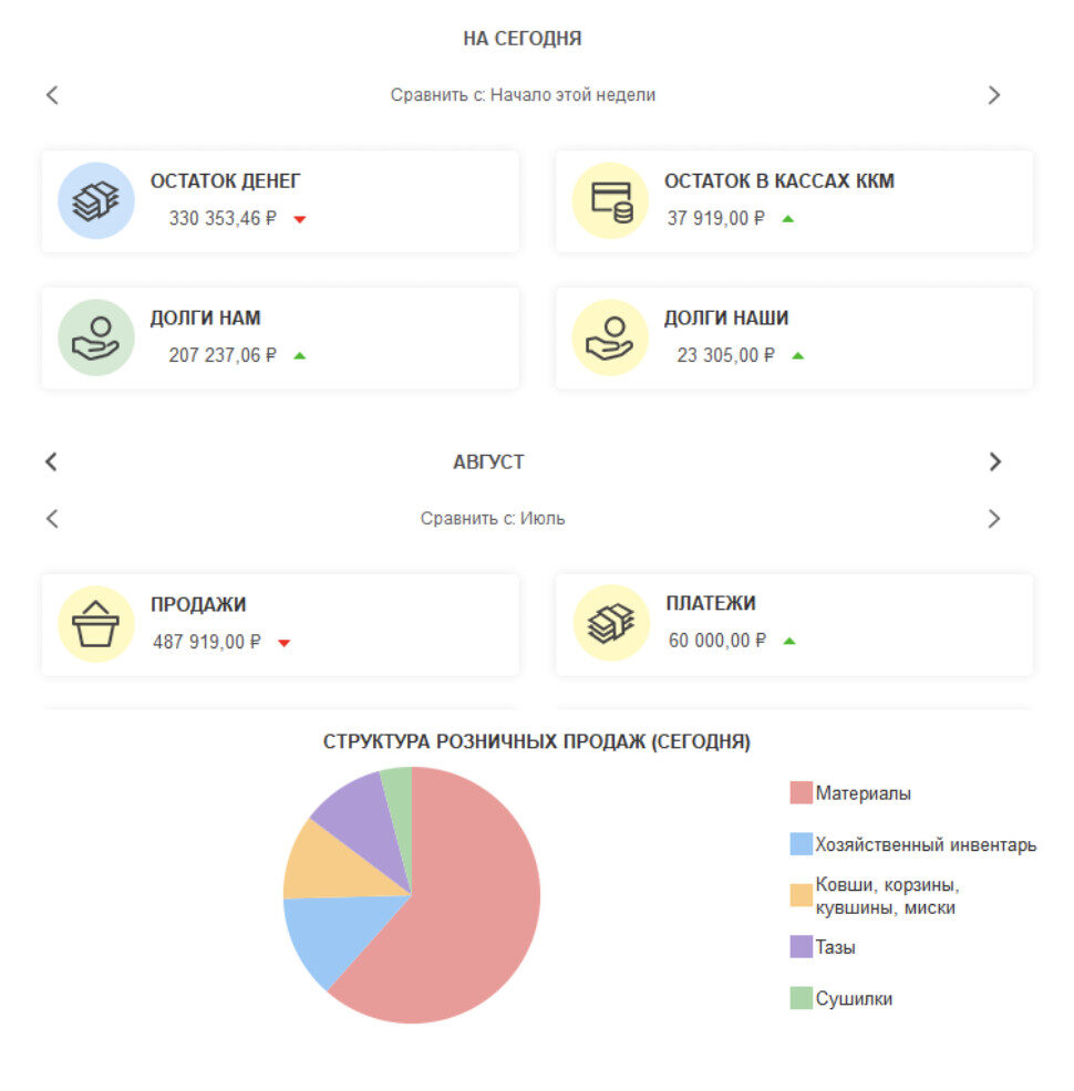 С помощью отчетов сможете вести учёт продаж по всем каналам, начиная с заявки до завершения сделки, анализировать объём продаж, деньги в кассе, выручку, задолженность покупателей, средний чек, валовую прибыль и прочие метрики, важные для бизнеса.