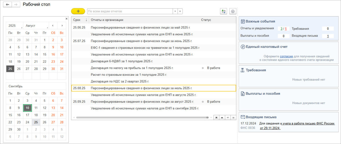 Например, в БизКуб Отчетность можно открыть ближайшие два месяца и увидеть, какие налоги в какую дату нужно будет сдавать. В этом же окне другие важные уведомления