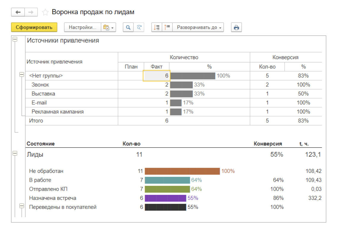 Оценить работу воронки продаж можно в отчётах. Вот как мы сделали её в приложении БизКуб CRM