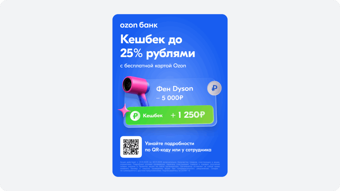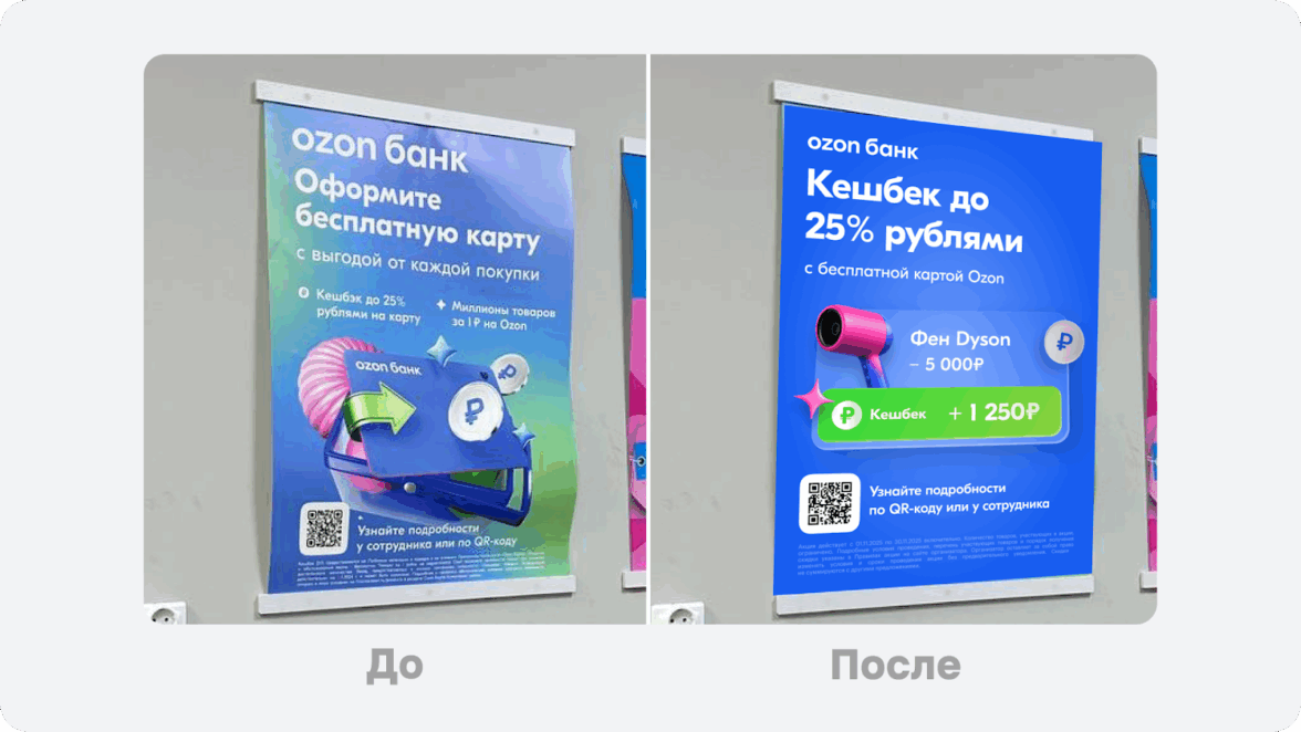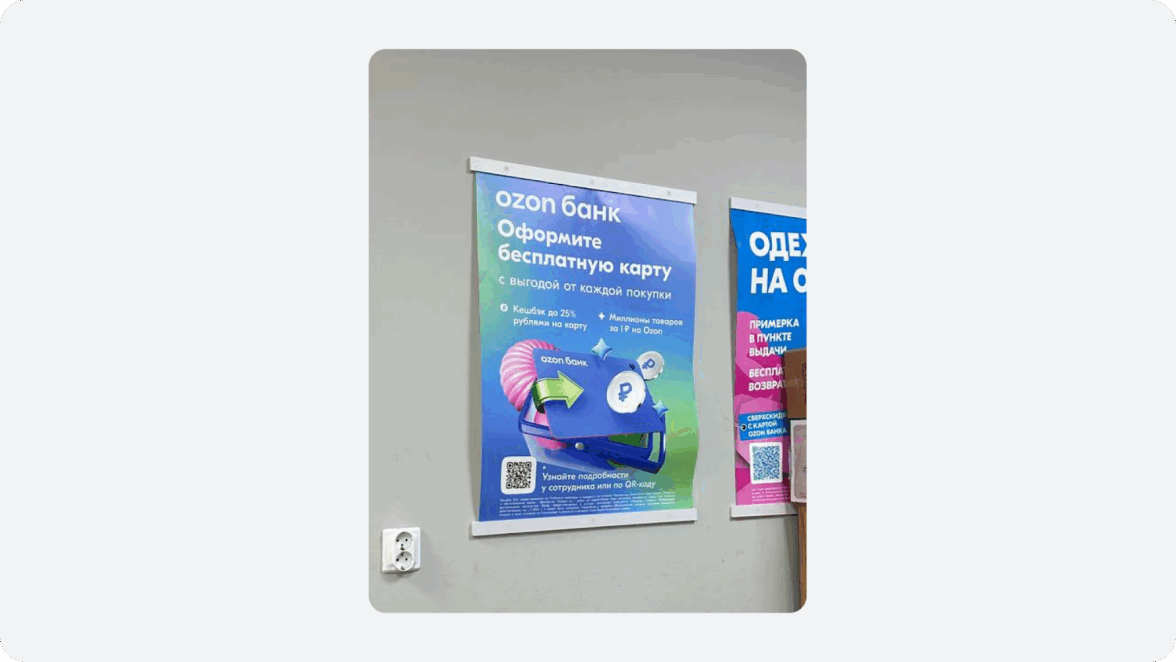 Недавно я забирал заказ в пункте выдачи Ozon и, пока стоял в очереди, взгляд зацепился за баннер. Что-то в нём явно не так — решил сфотографировать и разобраться, что можно улучшить.