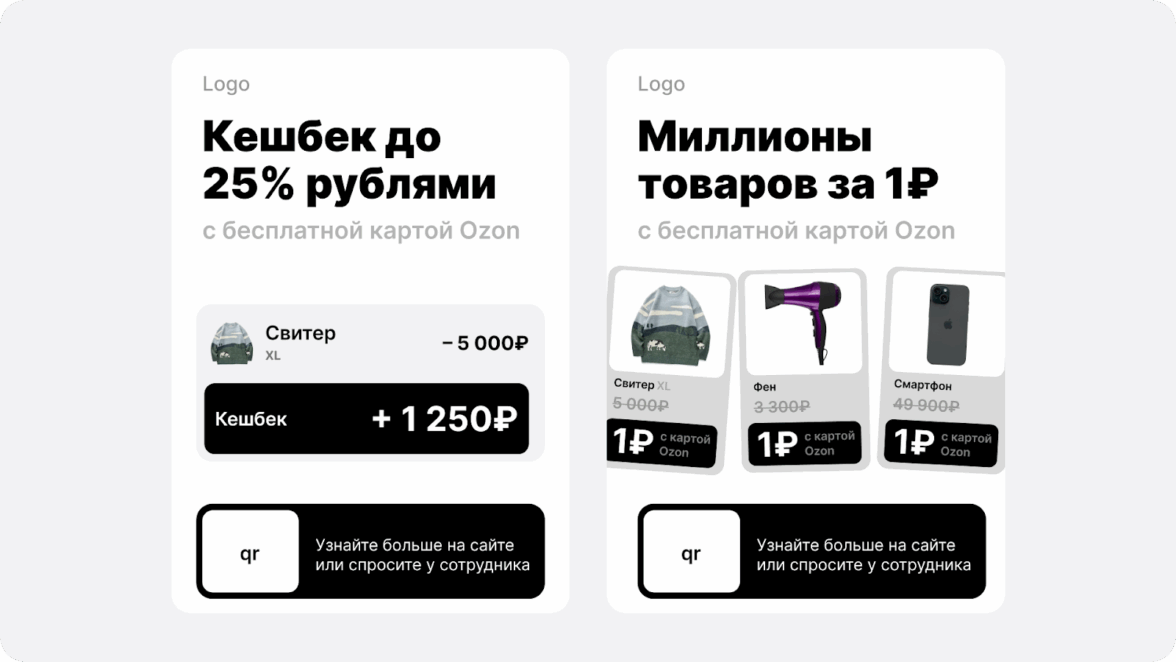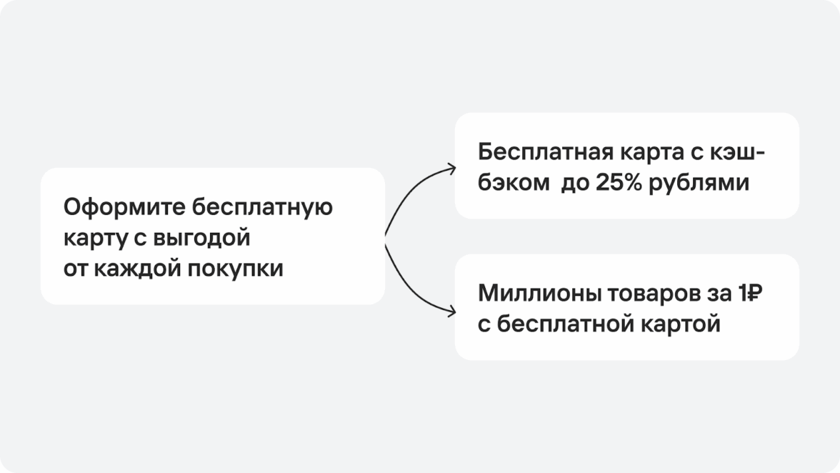 У нас есть два реально сильных оффера — кэшбэк 25% и миллионы товаров за 1₽.По сути, этого уже достаточно, чтобы мотивировать человека оформить карту.