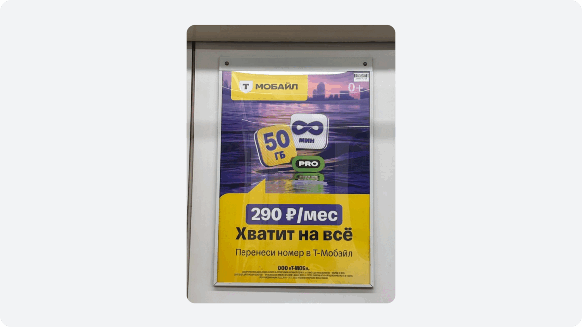 В реальных сценариях — в очереди, на улице, при беглом взгляде — человек тратит на баннер одну-две секунды. За это время он успевает увидеть только самое яркое. У конкурентов часто используют крупные цифры или визуальные акценты на выгоде — это помогает не потерять смысл в потоке информации. В нашем случае крупный «25%» или «1₽» могли бы стать тем самым «якорем», который удержит взгляд и сразу объяснит, в чём выгода. Например, можно посмотреть на баннер Т-Мобайл. На нем ключевые смыслы сразу бросаются в глаза: