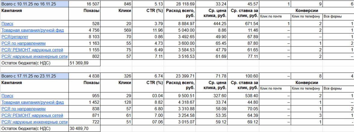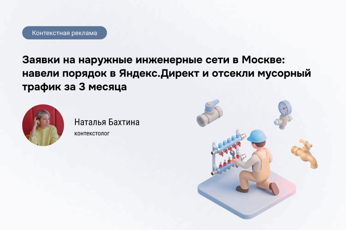 «В этом проекте главная сложность была не «накрутить кликов», а отделить целевые запросы на инженерные сети от случайной аудитории из РСЯ. Решили это через чистку площадок, корректировки по аудиториям и настройку нормальных целей, чтобы оптимизация шла по заявкам, а не по кликам».