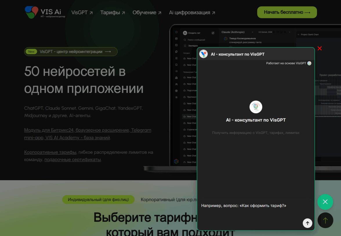 Посетитель видит иконку чата, кликает и попадает в диалоговое окно. Вводит вопрос: «Какие нейросети в базовом тарифе?» или «Как создать агента для аналитики?»