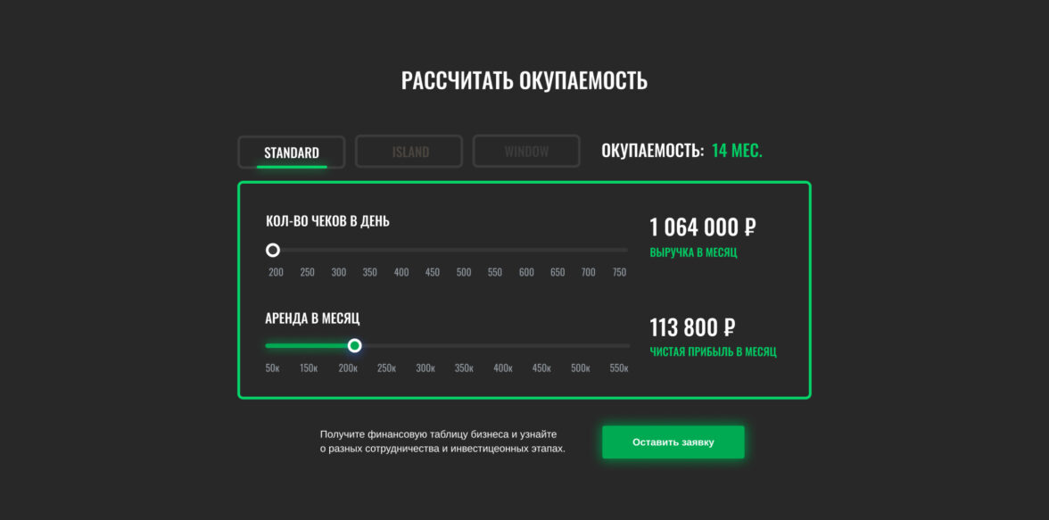 Потенциальным покупателям франшизы важно понимать всю экономику своих вложений. Для этого мы разработали простой, но эффективный калькулятор расчёта окупаемости. Пользователь выбирает 3 параметра: