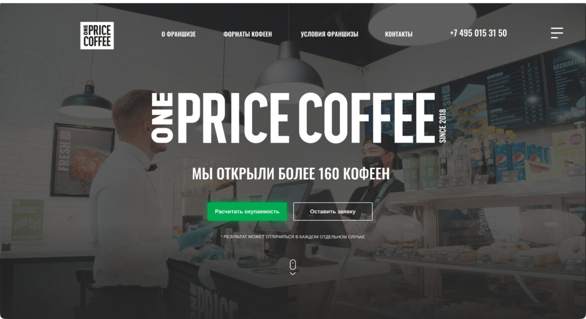 Мы реализовали поставленную задачу: разработали сайт сети кофеен с креативными анимациями и дизайном в фирменном стиле One Price Coffee, целью которого являлось привлечение заявок на продажу франшиз.