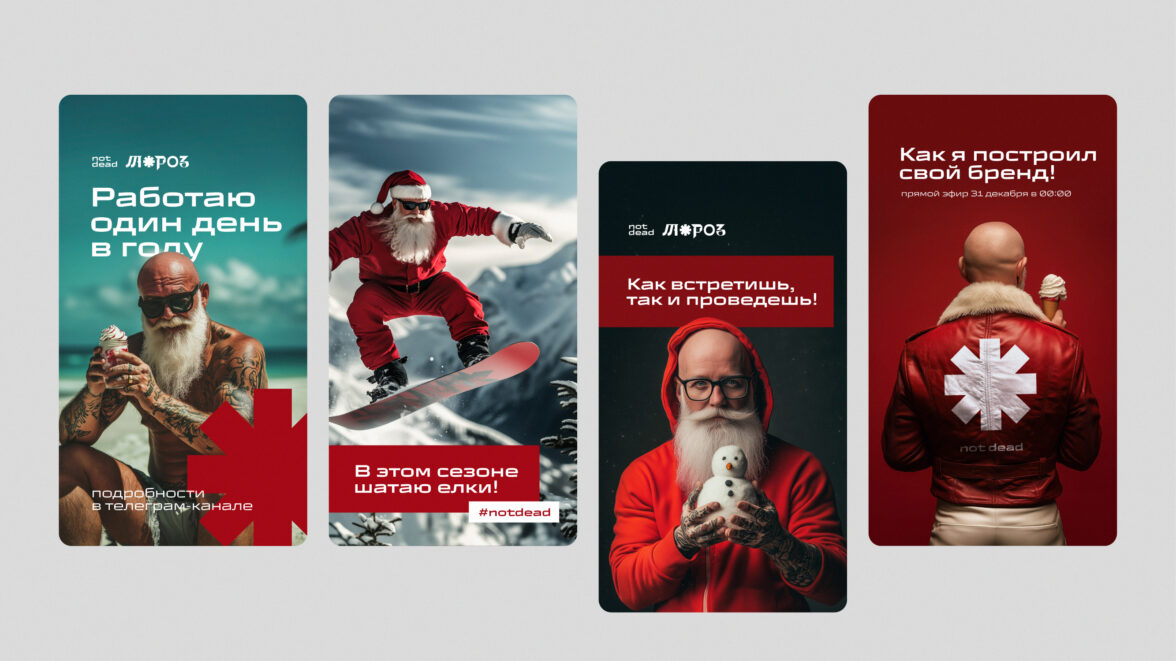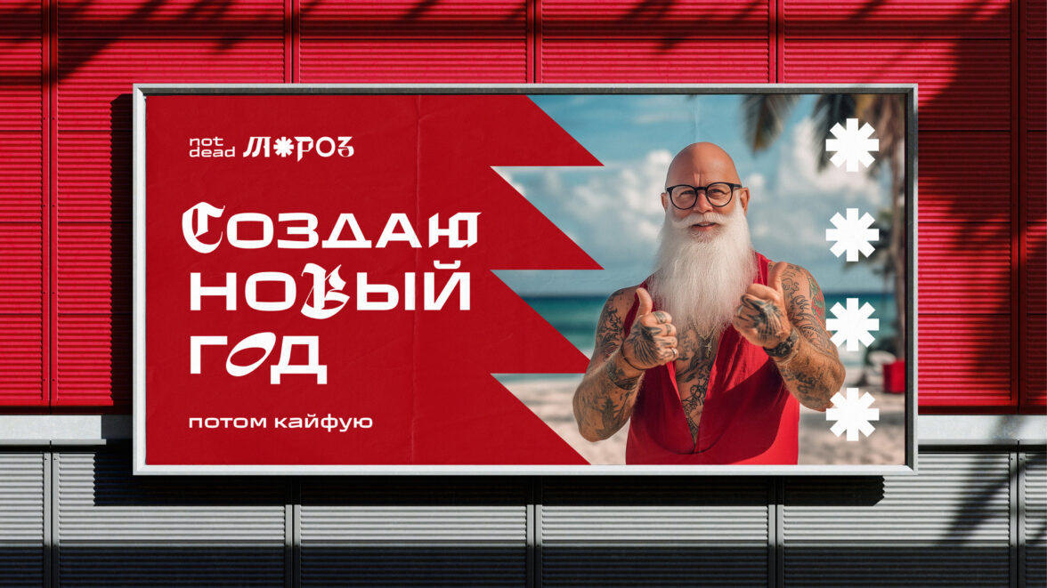 Не Dead Мороз — это сочетание новогоднего веселья с неожиданным твистом, напоминающий нам, что праздник может быть таким, каким мы его видим. Мы постарались отобразить это и в самом дизайне: яркие детали, контрастные элементы и современные визуальные решения передают дерзкий и свободный характер.