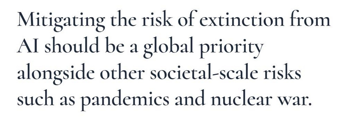 Заявление опубликовано на сайте некоммерческой организации Center for AI Safety (Центр ИИ-безопасности) из Сан-Франциско. В отличие от прошлого воззвания сегодняшнее максимально лаконично: «Снижение риска вымирания (человечества) из-за ИИ должно быть глобальным приоритетом наряду с другими рисками общественного масштаба, такими как пандемии и ядерная война».